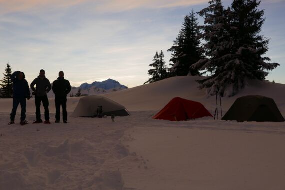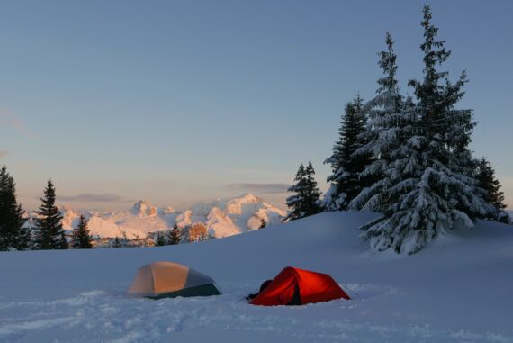 Après le briefing de départ, nous commençons notre ascension en direction de notre lieu de bivouac. Nous évoluerons entre forêt et alpages hors sentiers, dans un environnement vierge et préservé. Puis, la vue se dégage sur les montagnes environnantes. Il est temps de repérer le lieu idéal pour installer notre bivouac. Au programme de cet après-midi, installer sa tente dans la neige, faire une table dans la neige pour le repas, profitez des couleurs du soir en faisant l’apéro, partager un bon repas et profitez du spectacle que nous offre la nature.