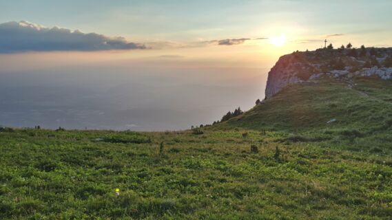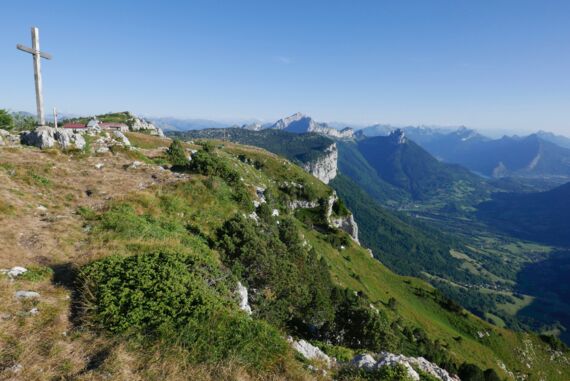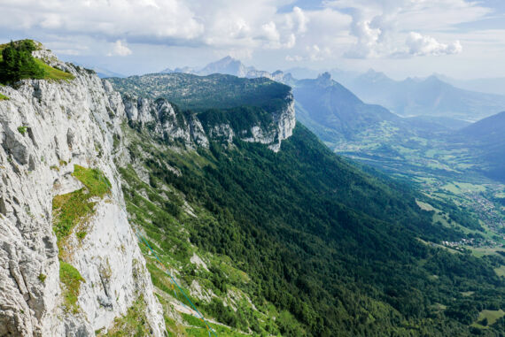- Vue panoramique sur les Aravis, le Mont-Blanc, le lac d’Annecy